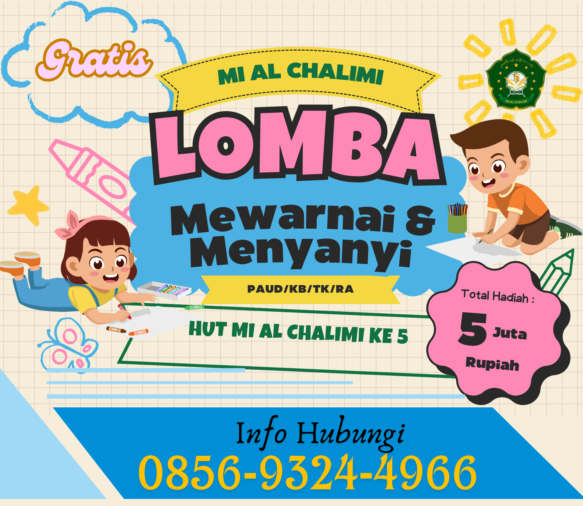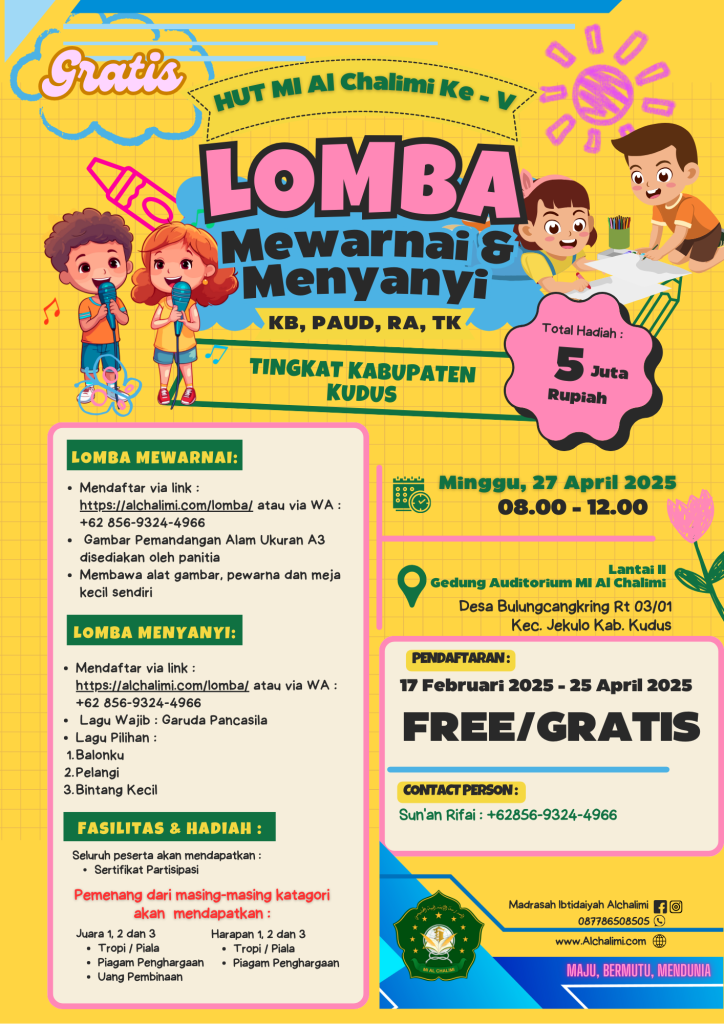 Kudus – Dalam rangka memperingati Hari Ulang Tahun (HUT) yang ke-5, Madrasah Ibtidaiyah (MI) Al Chalimi Jekulo Kudus akan menggelar lomba mewarnai dan menyanyi tingkat PAUD, KB, TK, dan RA se-Kabupaten Kudus. Acara ini akan diselenggarakan pada tanggal 27 April 2025 dan diharapkan dapat menjadi ajang kreativitas bagi anak-anak usia dini di wilayah Kudus.