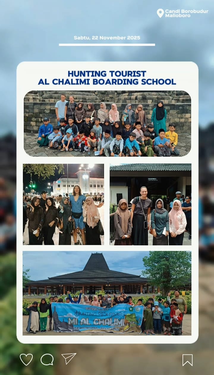 Rombongan berangkat pukul 04.00 WIB dari Pondok Pesantren Al Chalimi dan tiba di destinasi pertama, Candi Borobudur, sebagai ikon sejarah dan budaya nasional. Di lokasi ini, para siswa melakukan observasi, pengenalan peninggalan sejarah, serta dokumentasi langsung objek wisata sebagai bagian dari proyek pembelajaran.